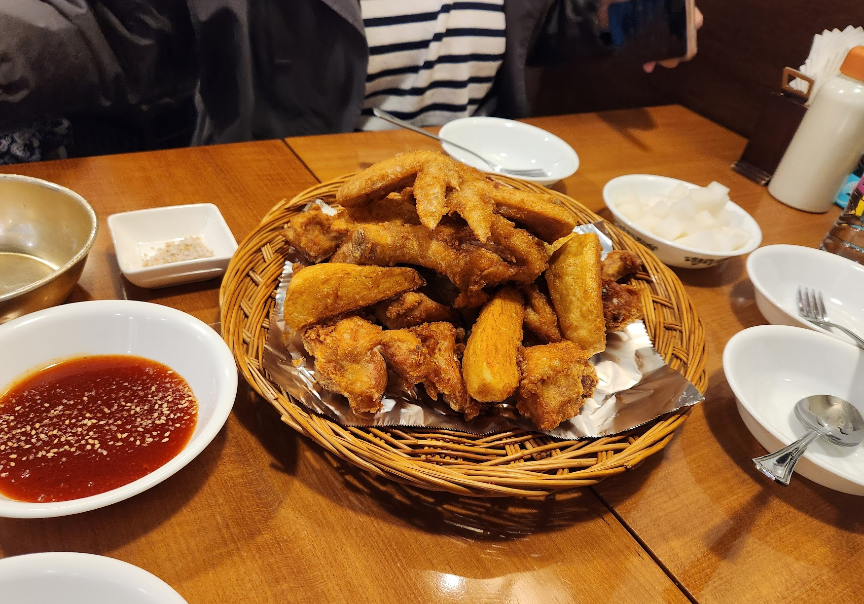 저희는 지하로 내려갔습니다. 치킨은 이렇게 나와요. 감자도 같이 튀겼습니다. 배고파서 그런지 더 맛있어요. 바삭하게 튀겼고 가슴살 같은 경우에는 칼집을 내서 좀 더 안쪽까지 튀기려고 했네요.