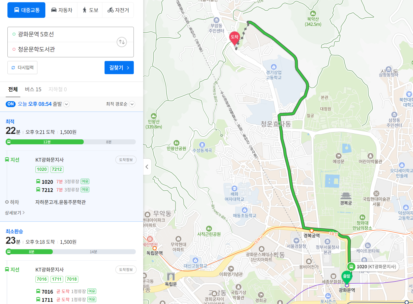 광화문역 2번 출구쪽에서 1020번 타시면 됩니다. 토요일에는 탈 수 있는 버스를 미리 확인하시는 것이 좋아요. 광화문 근처에는 시위하시는 분들이 많아서 버스가 우회해서 탈 수 없는 경우가 있어요. 저희는 7212번을 탈 수 없었습니다.