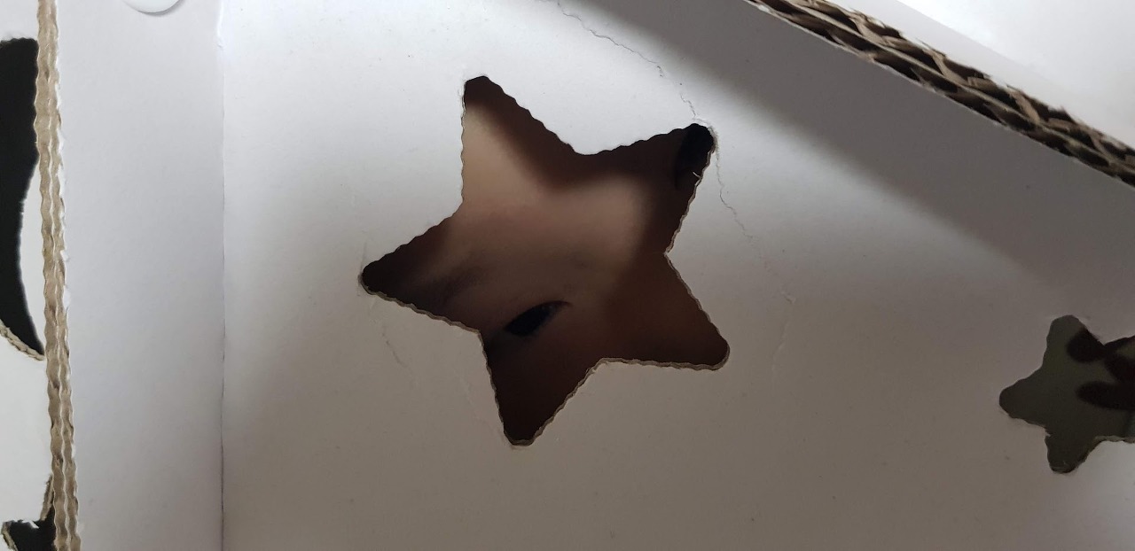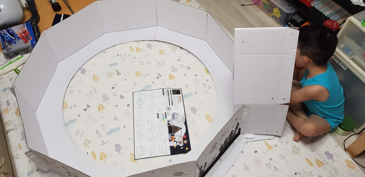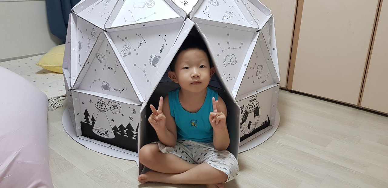 그런데 쪼꼬미 엄마가 보더니 이렇게 더러운 상자들을 어디서 주워왔냐고 하면서 버리라고 하네요. 그러면서 쪼꼬미에게 맞는 집을 주문했습니다. 우주안에 있는 느낌을 줄 수 있는 키즈스페이스입니다.
