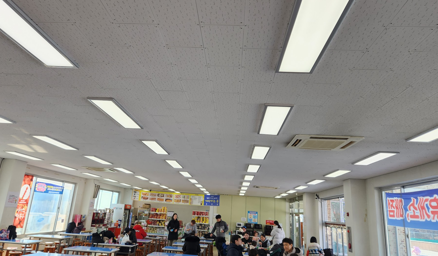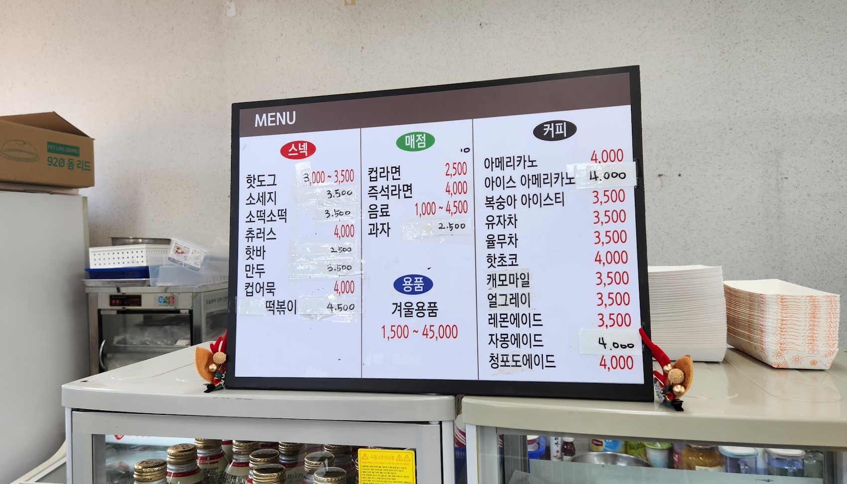 매점이 따뜻했습니다. 과자는 모두 2,500원이고 컵라면도 2,500원입니다. 일반라면은 4,000원입니다.