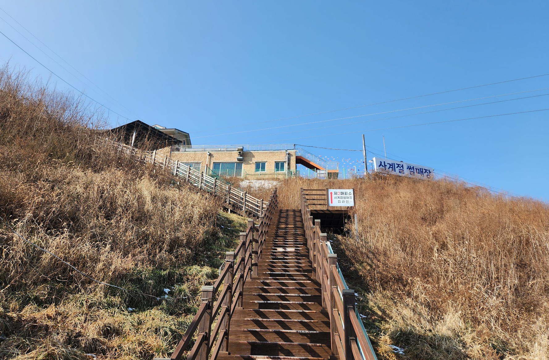주차장은 밑에 있고 눈썰매장은 계단을 걸어 올라가야 합니다. 나중에 보니 차가 위에 올라갈 수 있어서 가족들을 위에 내려주고 다시 주차장으로 내려와서 차를 대고 올라가시는 분도 있답니다.