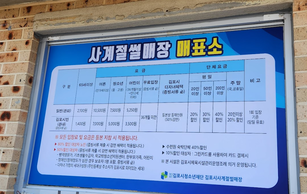 어른 10,500원 어린이 5,250원입니다. 김포시민이면 할인 혜택을 받을 수 있네요.