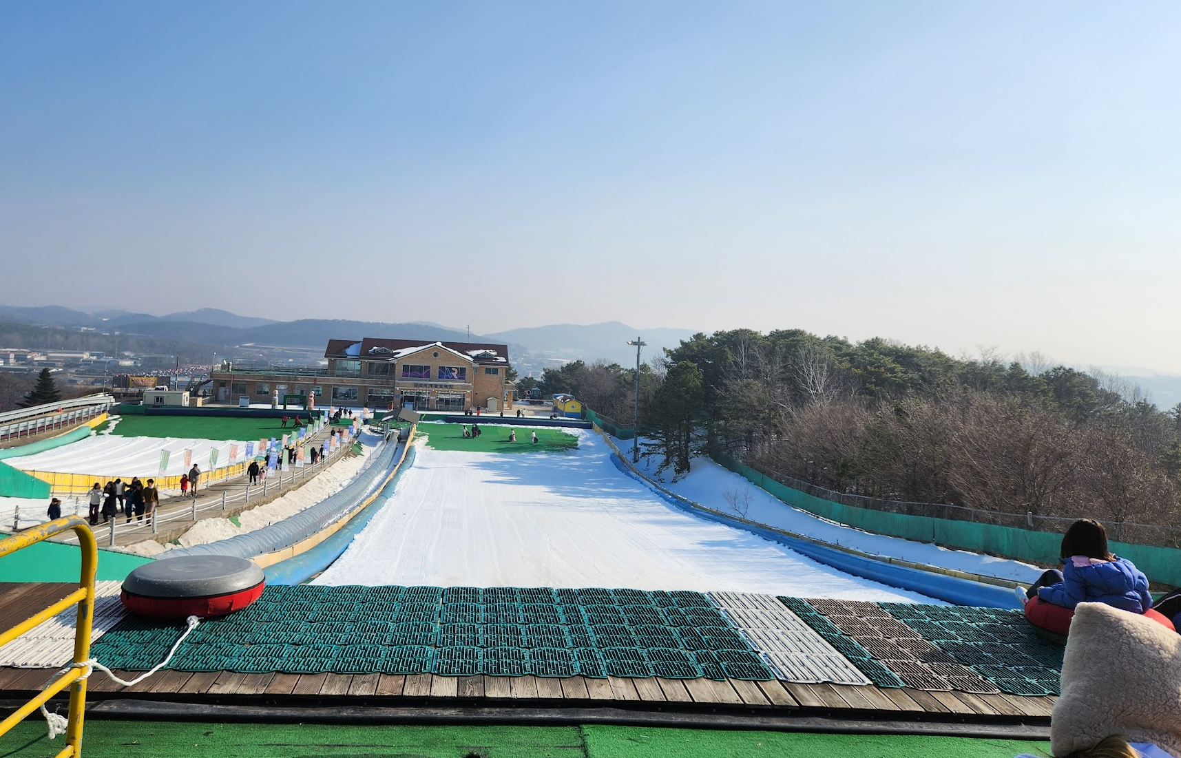처음에는 사람이 별로 없었는데 시간이 지나니 조금씩 많아졌습니다. 그래도 금방금방 탈 수 있었어요. 왼쪽에 보이는 비닐하우스 같은 곳은 기계로 썰매를 올리는 통로입니다. 기계소리가 너무 커서 좀 시끄러워요.