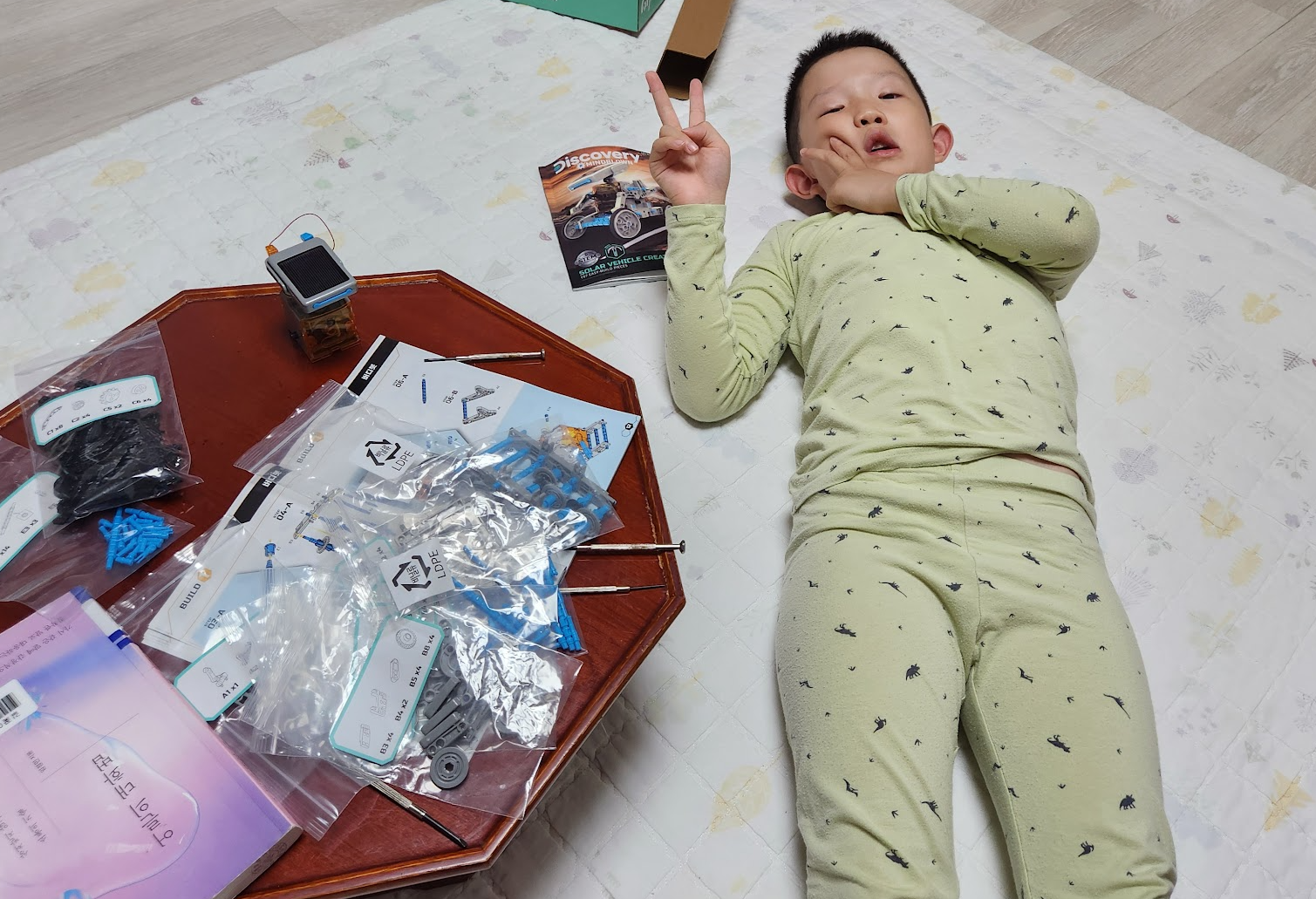 지난 어린이날 쪼꼬미에게 태양광으로 움직이는 로봇 키트를 사 주었는데 이제 씁니다. ㅋ