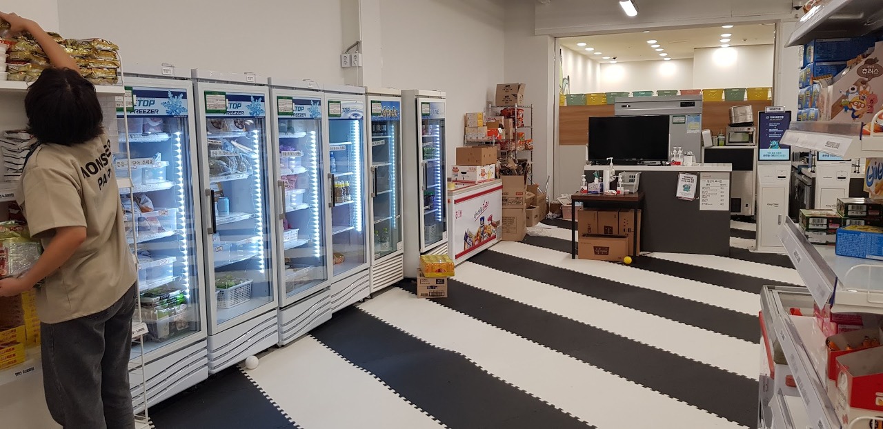 각종 냉동식품에 다양한 라면, 과자들이 있습니다.