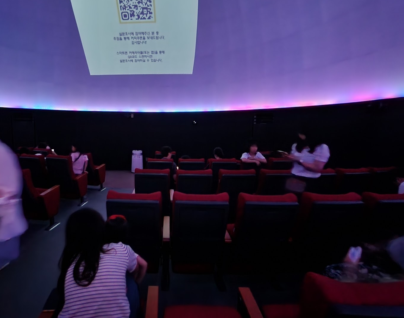 다들 의자를 뒤로 젖히고 누워서 관람합니다. 처음 영상은 망원경으로 우주를 관측하는 것에 대해 나옵니다. 그러면서 태양계 행성들에 대해 차근차근 설명하고 은하계, 별의 생성과 죽음 등에 대해 설명합니다.