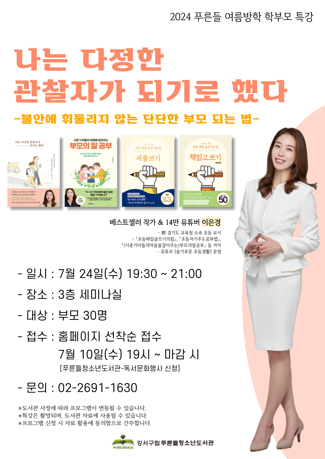 2024년 7월 24일 수요일, 푸른들청소년도서관에서 '슬기로운 초등생활' 유튜브 채널을 운영하고 있는 이은경 선생님의 특별 강연이 열렸습니다. 강연의 제목은 "나는 다정한 관찰자가 되기로 했다. 불안에 휘둘리지 않는 단단한 부모 되는 법"으로, 많은 학부모들에게 큰 도움이 되는 시간이었으며, 저도 그 중 한 명으로 참석하게 되어 영광이었습니다.