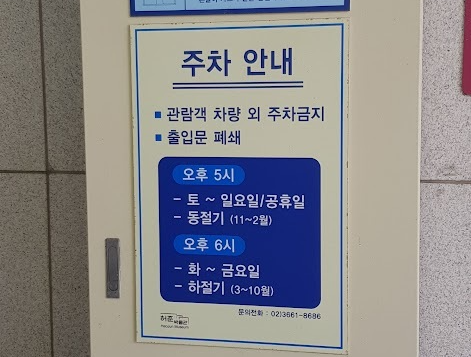 주차장에서 오른쪽으로 돌아가 조금 올라가면 입구가 나옵니다. 입구에는 시간대별 활성화되는 장부가 있습니다.