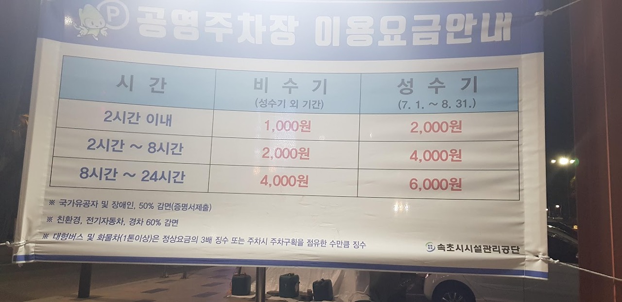 밤에 잠간 나와 야경을 보았습니다. 그러던 중 속초해수욕장 공영주차장 요금이 보였습니다.