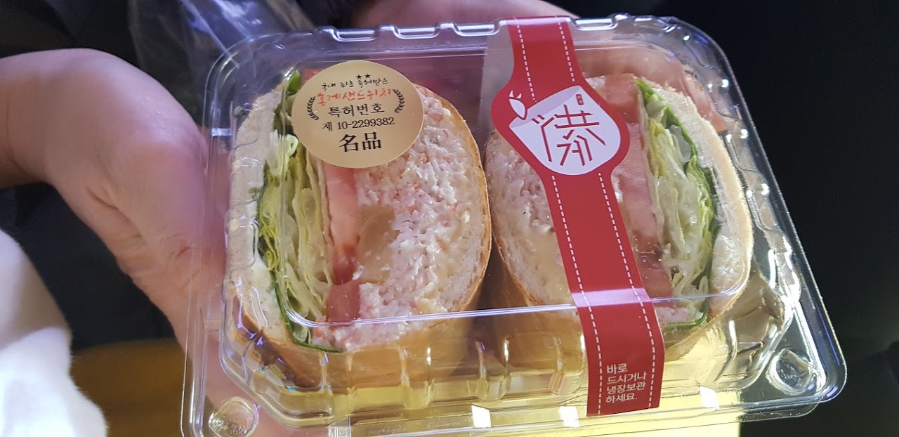 결국 11시 넘어까지 기다려 홍게샌드위치를 받았습니다. T.T 홍게샌드위치는 특허번호도 있네요.