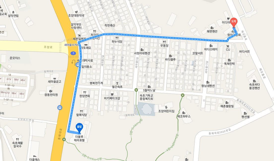 근처에 물회로 유명한 속초항아리물회 식당으로 갔습니다. 천천히 걸어서 약 8분 정도 걸립니다.