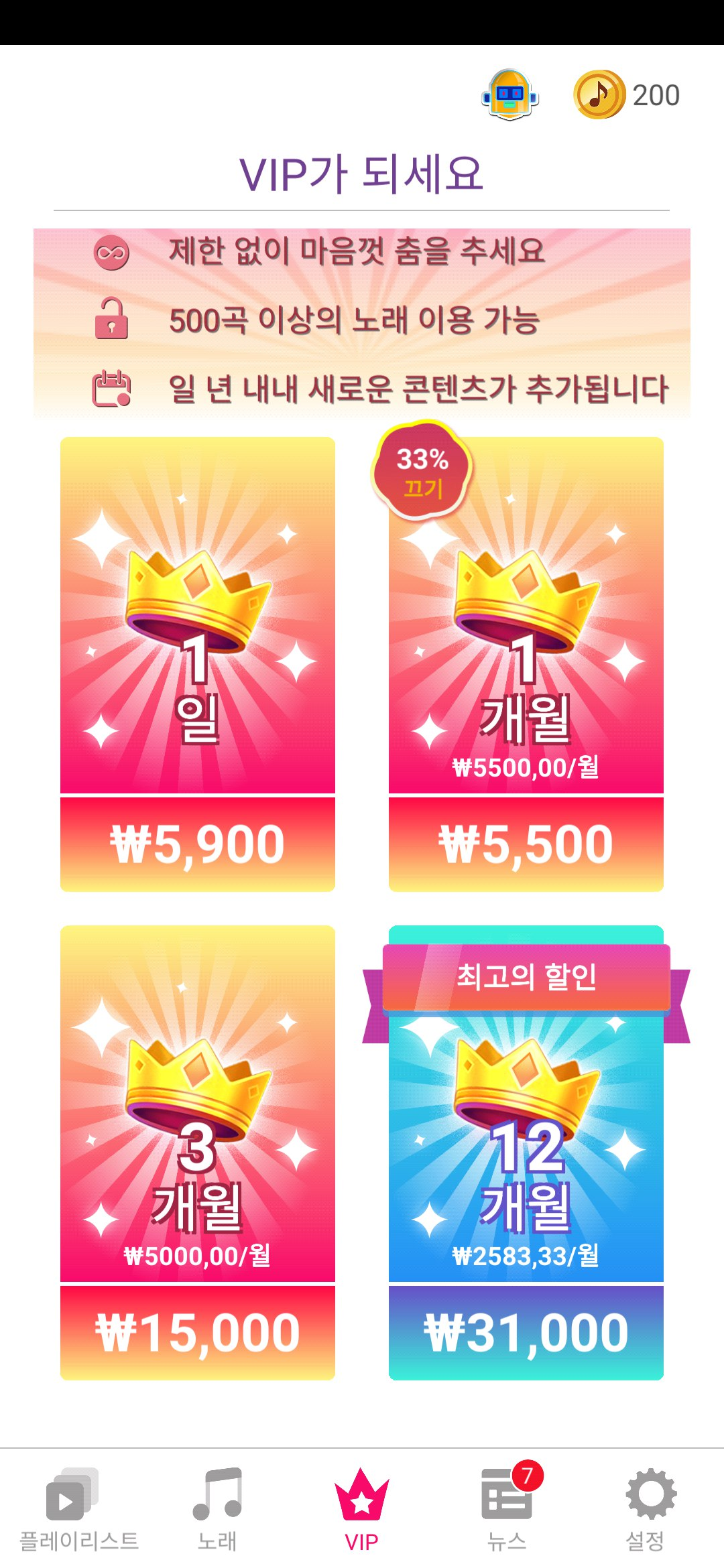 그런데 기본 코인은 200코인만 있기에 노래 2곡 정도 하고 나면 더 이상 춤출 수가 없습니다. 그래서 구독 결제를 하고 맙니다. ㅋ