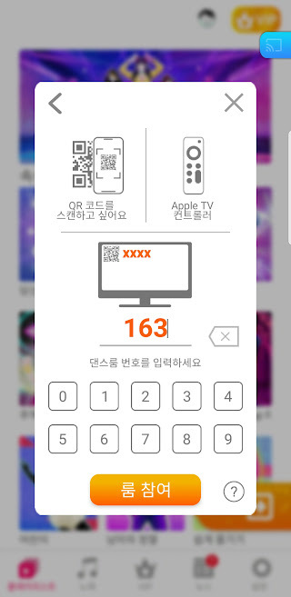 위에 있는 댄스룸 번호가 163번입니다. 그러니 163을 넣고 룸 참여 버튼을 터치합니다.