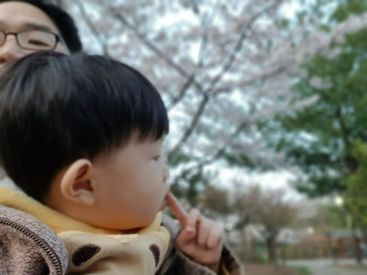 엄마랑 벛꽃 나무 아래를 걷던 쪼꼬미는 엄마한테 말합니다.