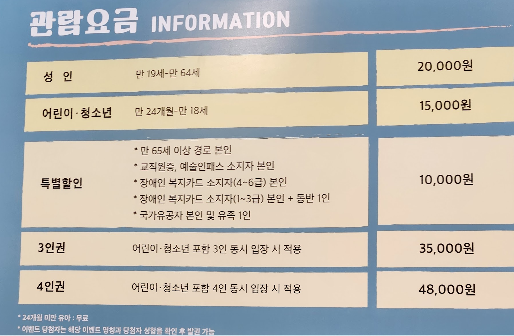 현재 오픈 기념 할인 이벤트를 진행 중이며, 성인 14,000원, 어린이/청소년 10,500원에 입장할 수 있습니다. 3인권과 4인권 단체 예매도 가능합니다. 위키트리