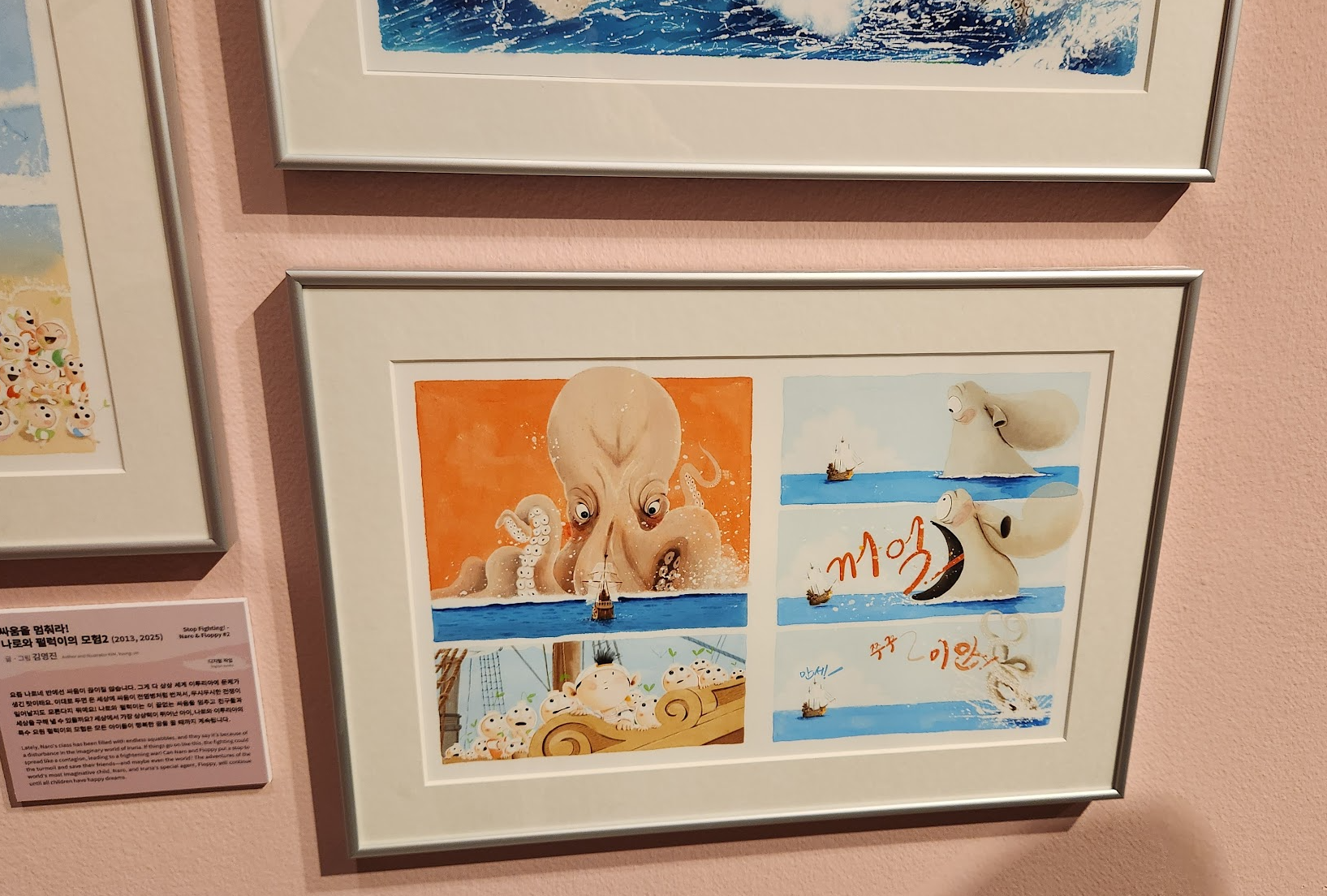 하지만 저는 쪼꼬미와 엄마의 반응과는 상관없이 전시회를 무척 즐겼습니다. 그림책 작가들의 원본 그림들은 정말 놀라웠거든요. 특히 김영진 작가의 그림은 제 마음을 사로잡았습니다. 그의 그림은 어떻게 이렇게 귀엽고 사랑스러울 수 있을까요?
