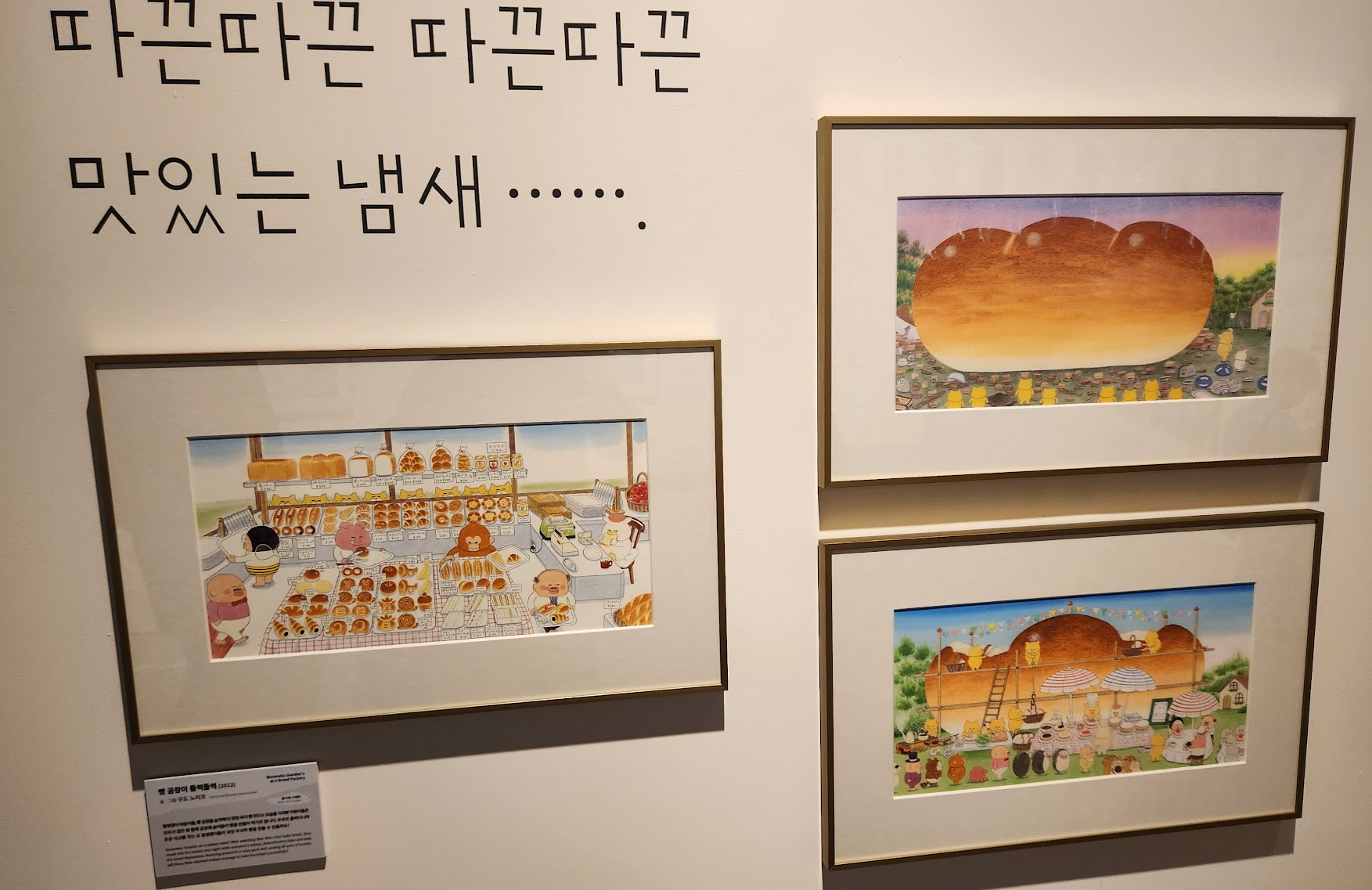 하지만 저는 쪼꼬미와 엄마의 반응과는 상관없이 전시회를 무척 즐겼습니다. 그림책 작가들의 원본 그림들은 정말 놀라웠거든요. 특히 김영진 작가의 그림은 제 마음을 사로잡았습니다. 그의 그림은 어떻게 이렇게 귀엽고 사랑스러울 수 있을까요?