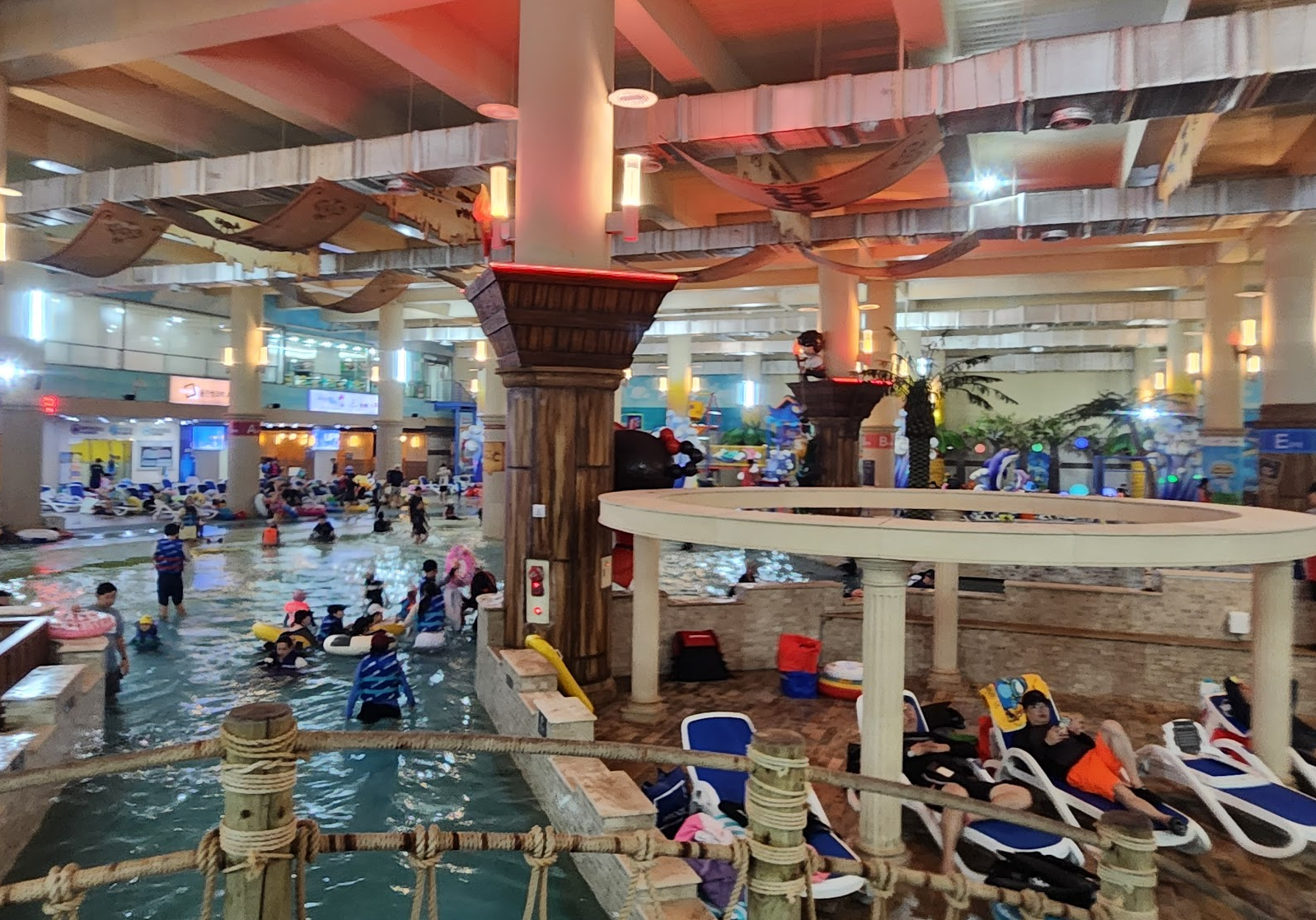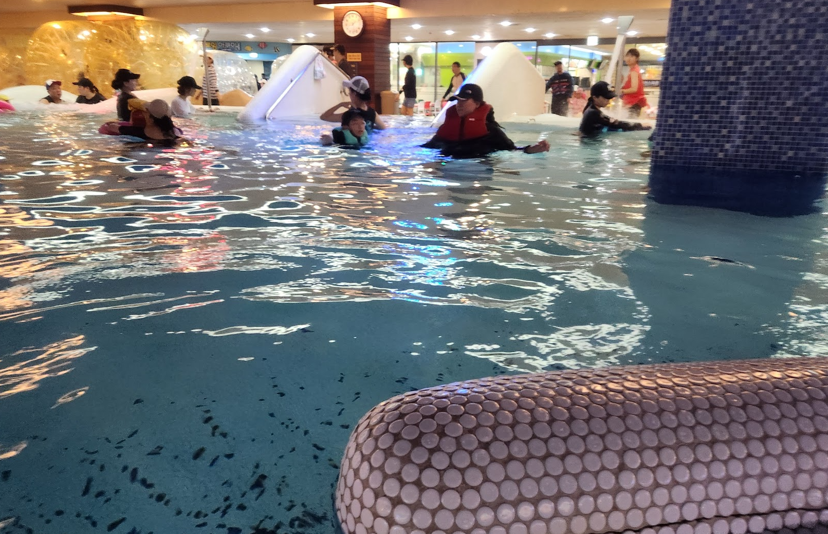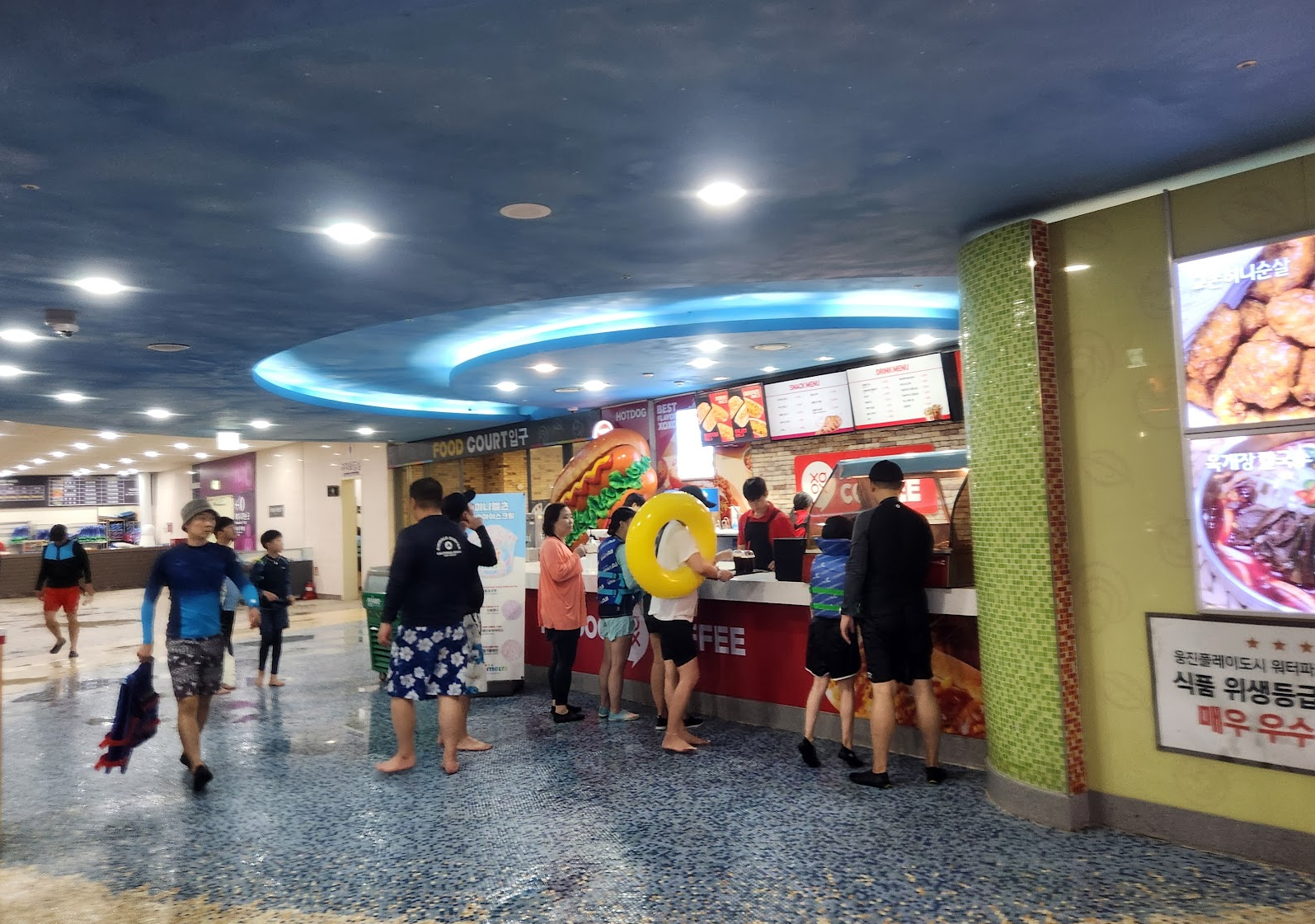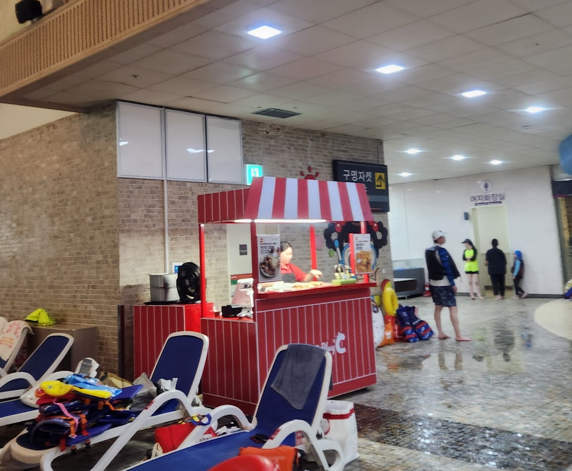 음식물 반입 : 기본적으로 음식물 반입 금지일텐데 어디에도 외부 음식물 금지라는 말은 못 봤습니다. 내부에는 가게가 많이 있고 푸트코트도 있어요. 반건조 오징어 냄새가 솔솔 풍겨서 먹고 싶기도 했습니다. 수영하면서 놀면서 집에서 가져온 음식들을 자연스럽게 꺼내서 먹는 분들을 많이 보았습니다.