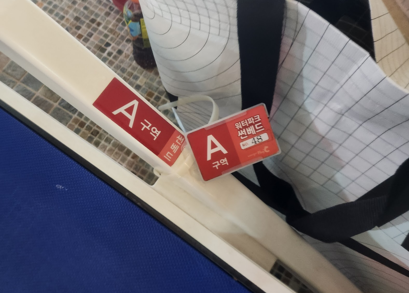 편의시설 대여: 편의시설 대여는 파도풀 근처에서 하는데, 빨간색 네모 표시한 쪽입니다. 본인이 차고 있는 락커룸키를 찍고 대여하시면 됩니다. A구역 B구역 등 구역을 정하시고 대여하시면 구역에 맞는 카드를 줍니다. 썬배드의 경우 받은 카드를 구역에 있는 아무 썬배드에 끼워서 사용하시면 됩니다. 저희는 썬배드 하나 빌려서 짐을 놓았고 우리 나라 특성상 썬배드에 짐 올려놓고 돌아다녀도 누가 가져가는 일이 없어서 편했습니다.