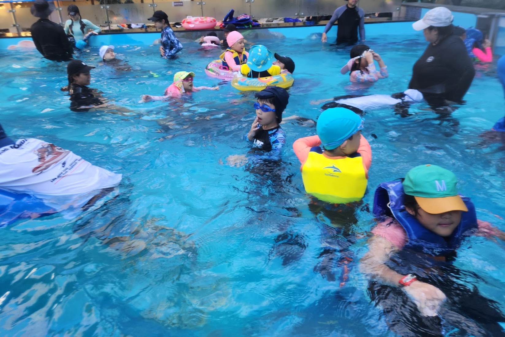 복장 : 대부분 래쉬가드를 입고 있습니다. 복장에는 규제가 없는 것 같습니다. 어떤 아저씨는 축구복을 입고 왔습니다. 하지만 모자는 꼭 착용해야 합니다. 수영모자 쓴 사람은 별로 없고 대부분 야구모자를 썼습니다. 어떤 모자든지 착용만 하면 스텝들이 아무 말하지 않습니다.