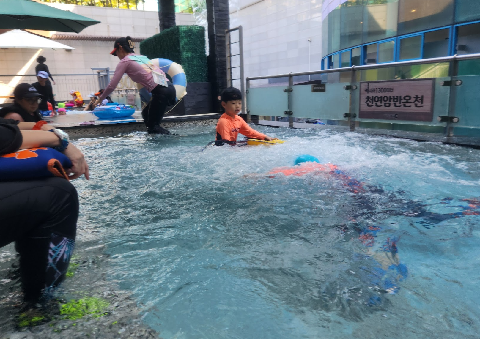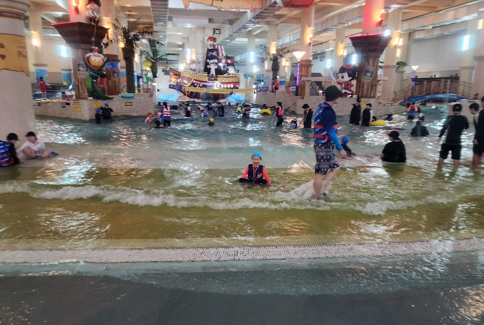 내부는 워터파크과 온천스파로 나뉘어 있는데 저희는 워터파크 파도풀 앞에 자리를 잡았습니다.