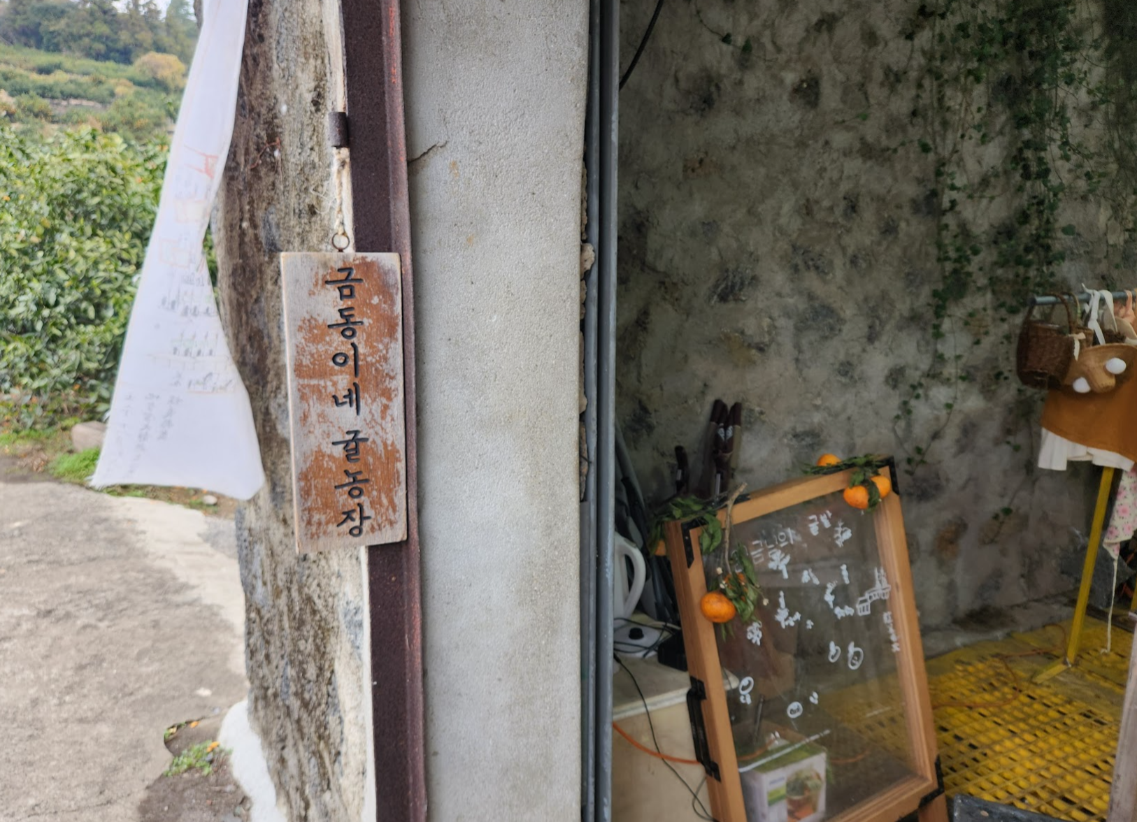 금동이네는 서귀포 시청이나 버스터미널에서 좀 더 가면 있는데 큰길에서 갑자기 조그마한 길로 들어갑니다. 나중에 차로 올라가다 보면 좁아서 "들어가면 나올 수 있을까?" 생각하게 됩니다. 그리고 차들이 지나가다가 담벼락을 긁은 흔적도 있습니다. 조심조심하면서 올라가시면 귤밭에 주차할 수 있는 공간이 나옵니다.