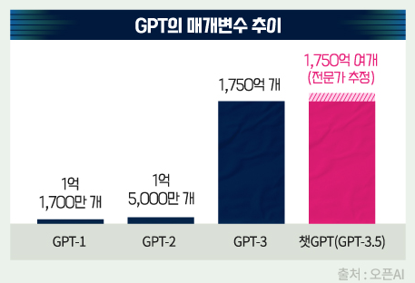 챗GPT(GPT3.5) 모델에 사용된 매개변수 개수는 대략 1750억 개로 추정됩니다.