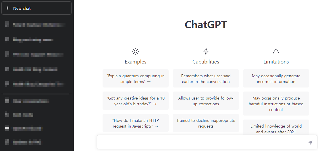 첫 화면입니다. 저는 이미 질문을 많이 해보았습니다. 아래 흰색창에 질문을 넣으시면 됩니다. 질문을 하시다가 다시 새롭게 하고 싶다면 왼쪽 위에 + New Chat을 클릭하고 다른 질문을 시작하면 됩니다.