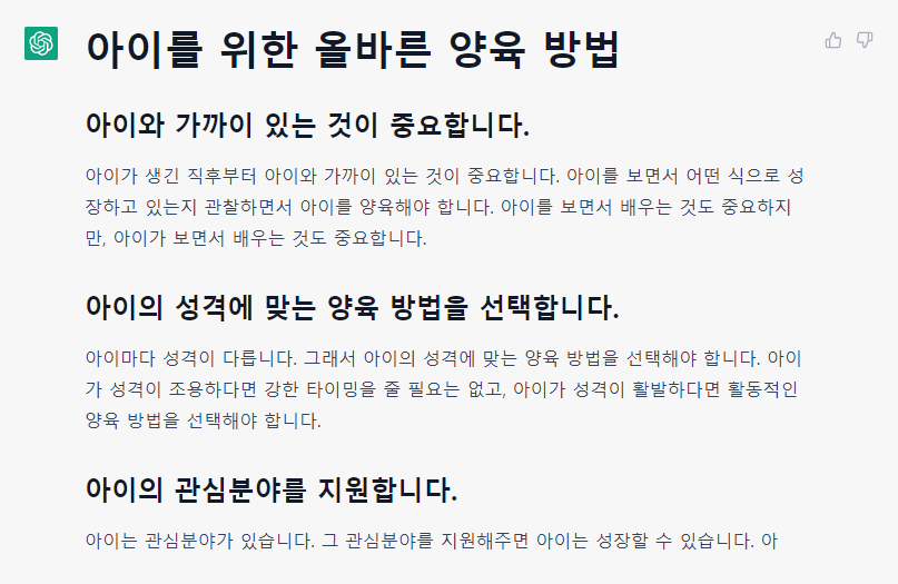 챗GPT로 블로그 글을 작성해 보겠습니다. 이 블로그는 "육아"에 대한 글을 주로 작성하니 육아에 관한 주제로 글을 하나 작성해 달라고 명령해 보겠습니다.