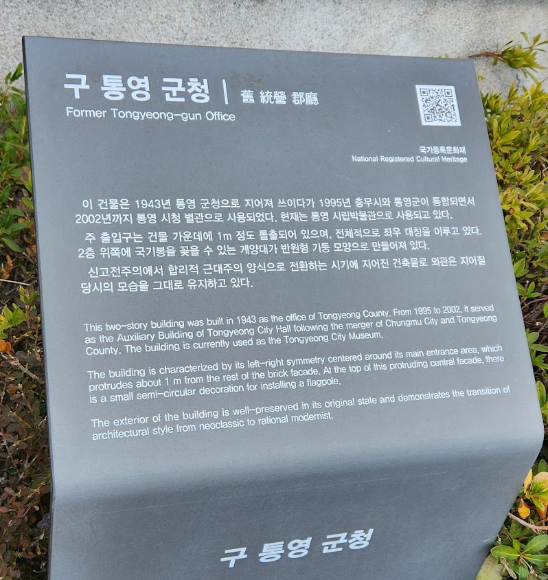 통영시립박물관은 원래 1943년에 지어져 통영 군청으로 사용되었던 건물입니다. 이후 박물관으로 탈바꿈하여 통영의 역사와 문화를 알리는 중요한 공간이 되었어요. 박물관의 외관은 오래된 건물의 멋스러움보다는 일제강점기의 튼튼한 시멘트 건물이라는 느낌을 받을 수 있습니다. 이는 당시의 건축 양식을 반영하고 있어 역사적인 의미를 더욱 부각시켜 줍니다.