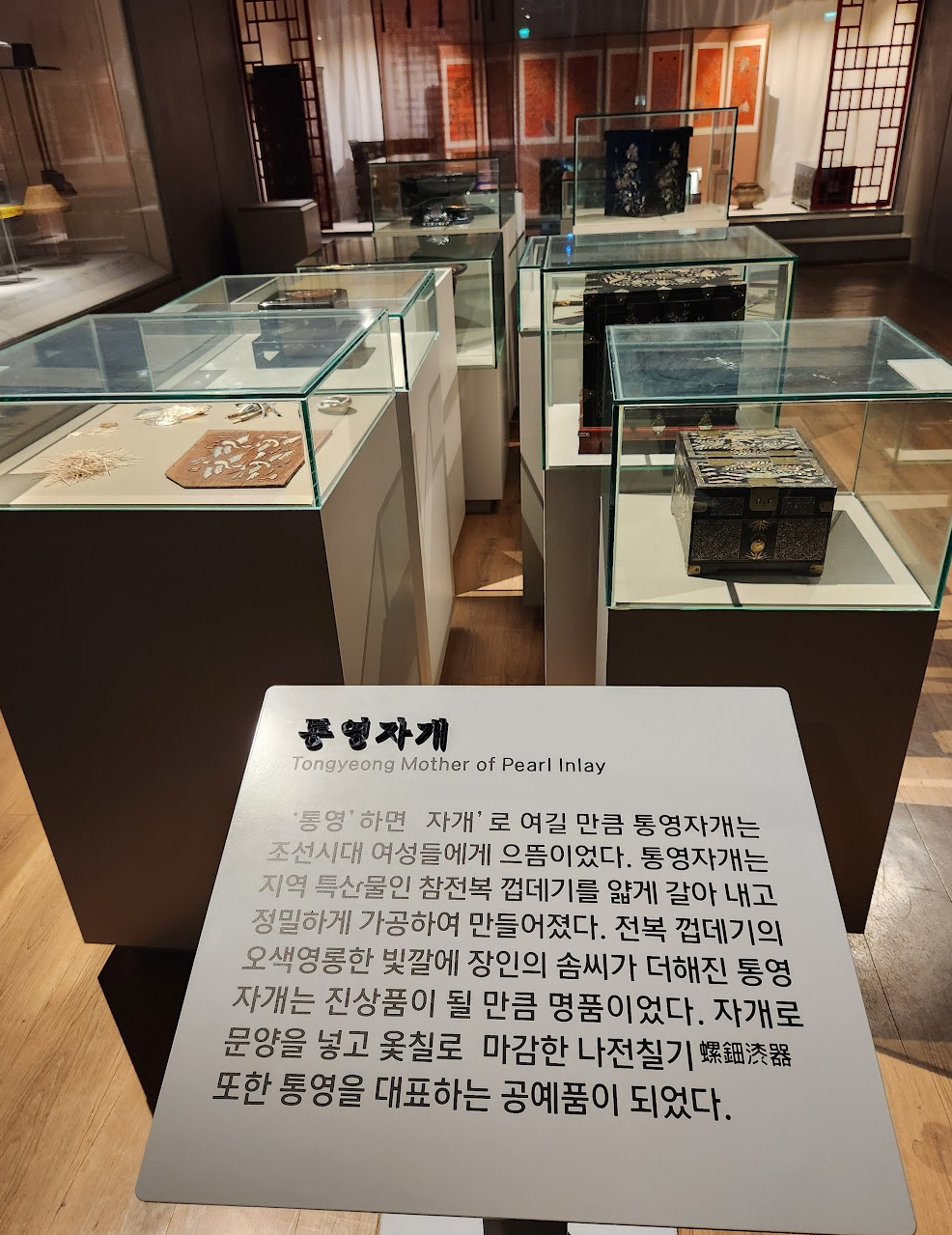 또한, 2층에서는 통영의 전통과 문화를 알 수 있는 다양한 물건들이 전시되어 있었습니다. 신석기시대부터 현대까지 이어지는 유물뿐만 아니라, 통영의 대표적인 공예품인 나전칠기 작품도 감상할 수 있습니다. 정교한 자개 장식이 돋보이는 나전칠기 작품들은 통영의 예술성과 장인 정신을 보여주며, 통영이 한국 전통 공예에서 차지하는 위치를 실감하게 합니다.