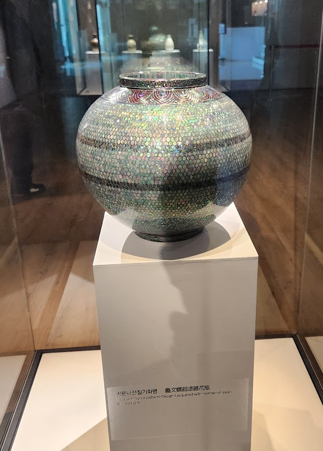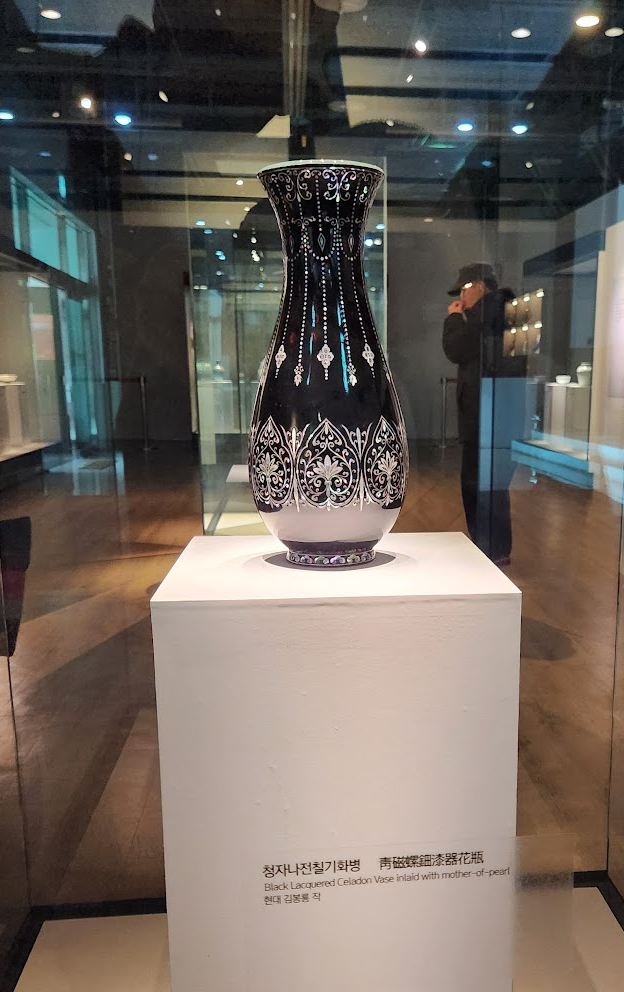 이 외에도 현대 도예 작가들이 만든 도자기도 전시되어 있었는데, 통영의 전통 공예인 나전칠기를 접목한 작품들이 특히 인상적이었습니다. 반짝이는 자개가 도자기 위에 장식된 모습이 매우 세련되면서도 전통적인 느낌을 함께 살려주었어요. 전통을 현대적으로 재해석한 작품들이 많아서 보는 재미가 쏠쏠했습니다.