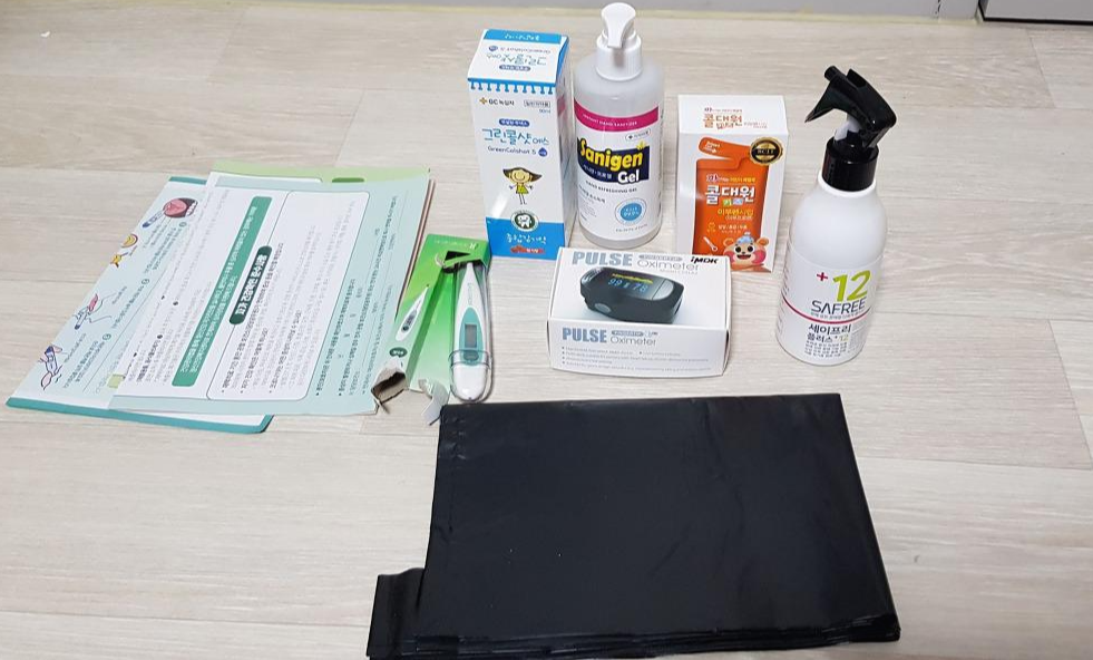 체온계, 종합감기약, 해열제, 소독제, 맥박계, 비닐봉지 같은 것들이 들어 있네요.