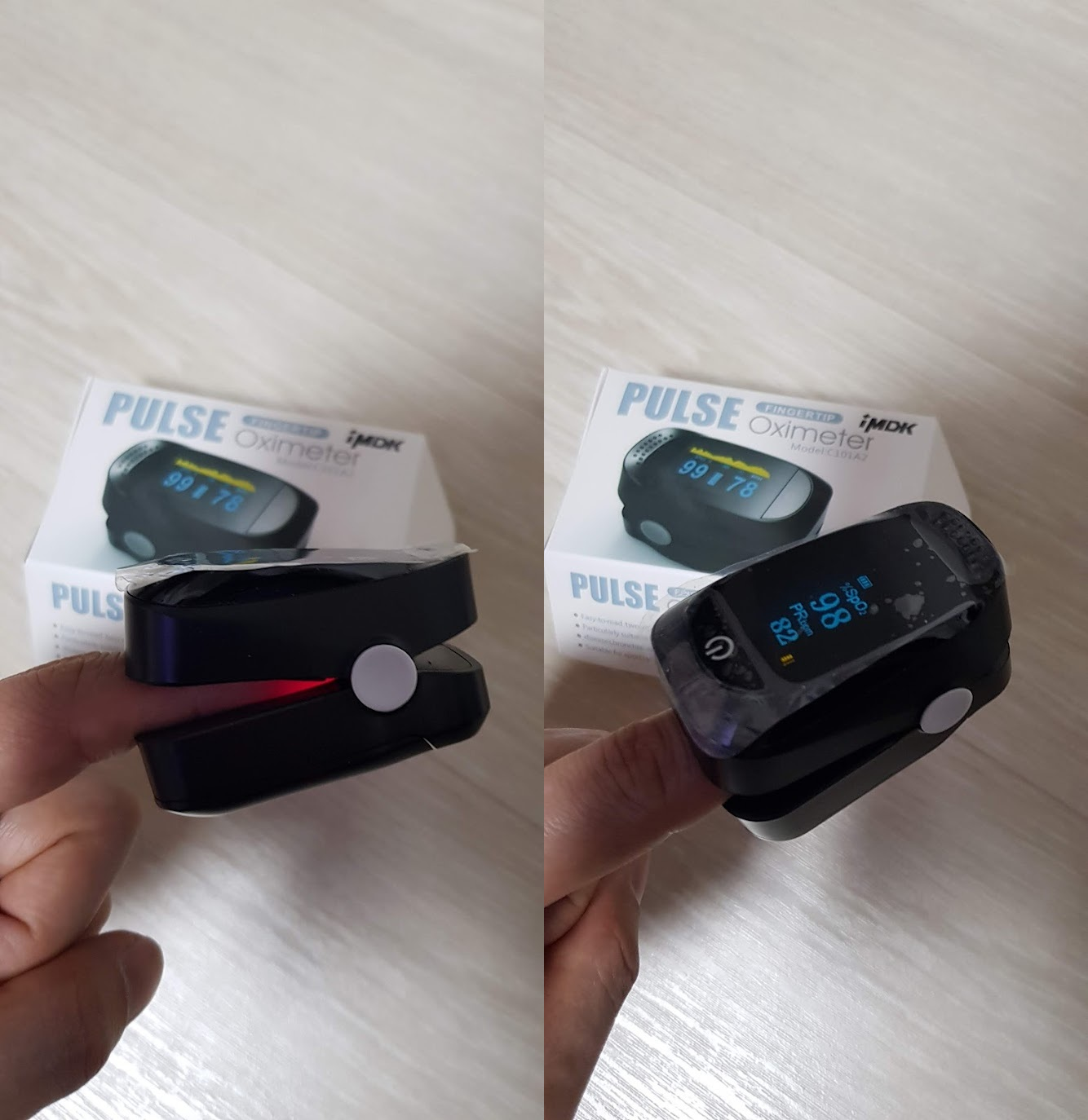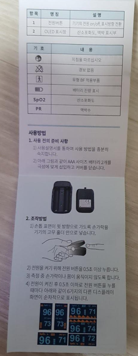 맥박계는 전원을 켜고 끼우고 가만히 있으면 자동으로 측정합니다. 위의 큰 숫자가 산소포화도인데 94 이하가 되면 위험하다고 합니다.