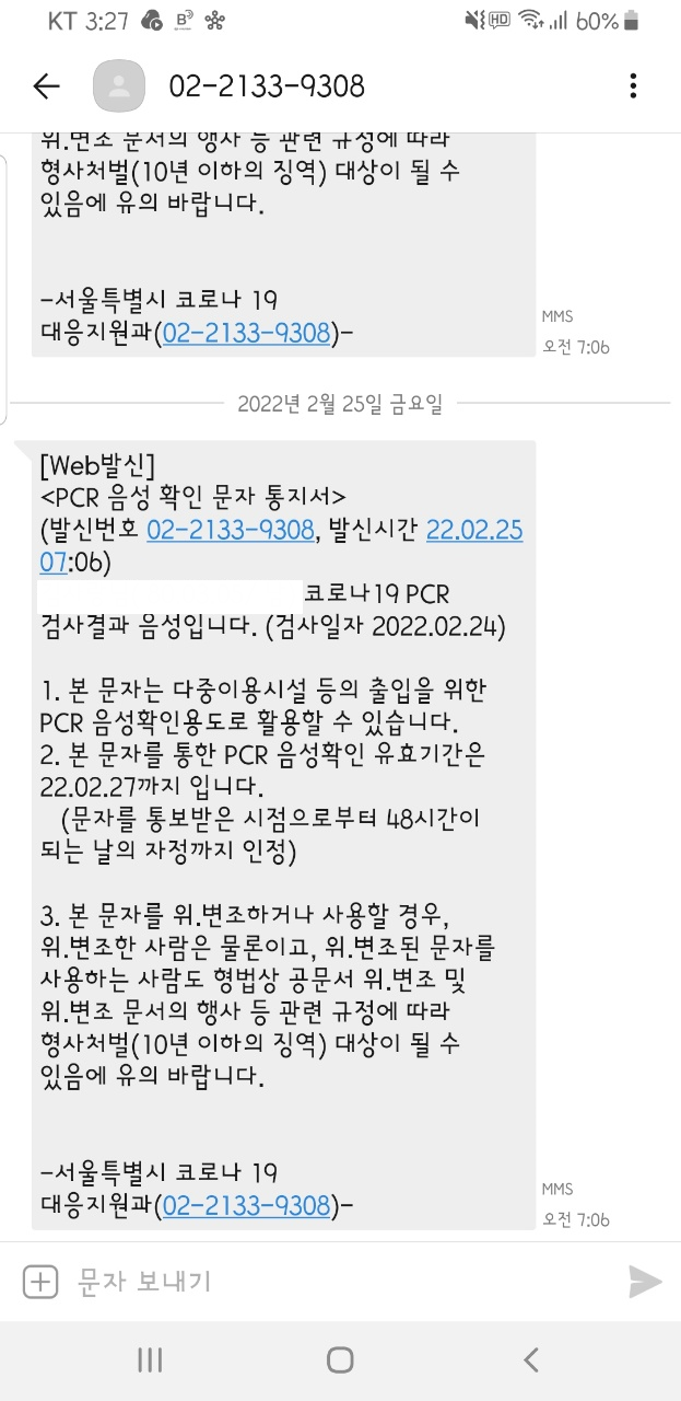그래서 바로 김포공항 임시선별진료소에 가서 검사를 받았습니다. 그리고 다음날 아침 7시가 조금 지나 문자가 왔습니다.
